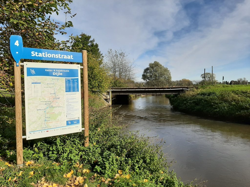 De instapplaats vind je in de Stationstraat in Korbeek-Dijle, stroomopwaarts van de brug over de Dijle. De instapplaats is aangegeven met een bord met nummer 4 (zie foto hoofding). Langs de oever is er voldoende plaats om je packraft op te blazen. Een kleine trap geeft je gemakkelijk toegang tot een platform en het water. Gebruik de kajakglijbaan niet.