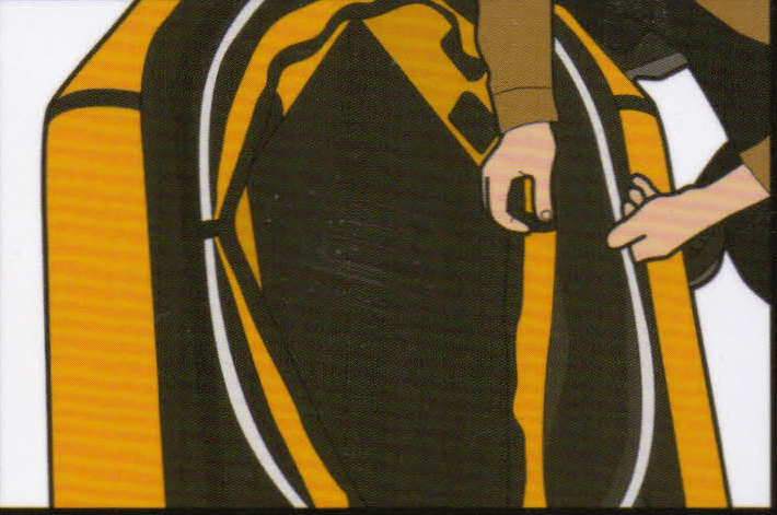 Rol de packraft op in de richting van de ventielen. De laatste lucht wordt er zo uitgeduwd. Doe het ventiel dicht en sluit het af met de klep. Steek de opgerolde packraft in de zak, samen met de rest van het materiaal.