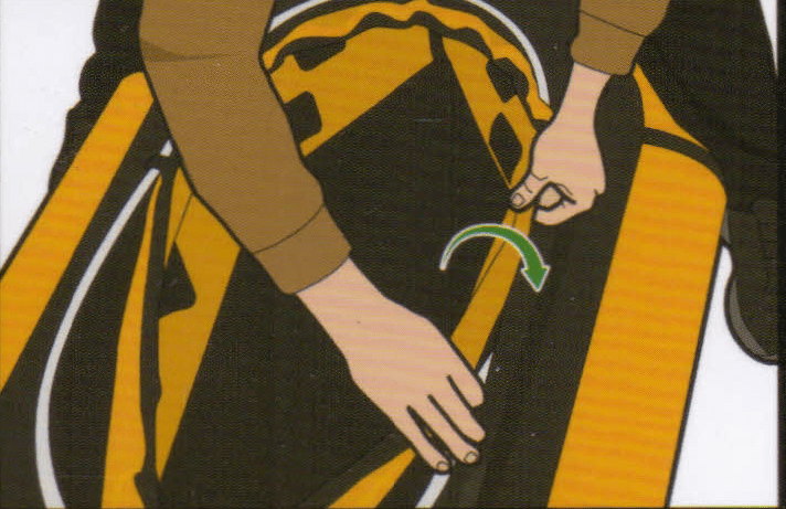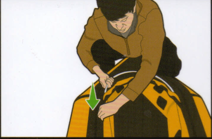 Verwijder het opblaasbaar zitje, maar laat de rugsteun zitten. Haal de plastiek ring van de boot. Zet alle ventielen open en laat de lucht ontsnappen. Je kan op de packraft duwen om de lucht er sneller uit te krijgen. Doe dit op gras of een gladde ondergrond. Vermijd kiezel of scherpe stenen.