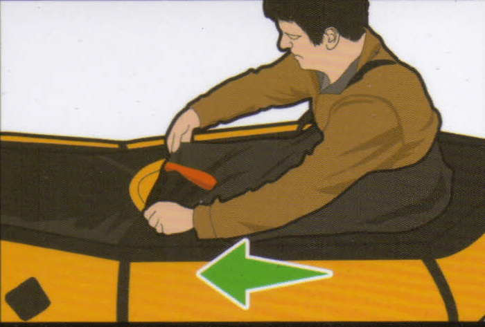 Doe je schortje aan onder je zwemvest, maar boven alle ander kledij. Zorg dat de rode lus vooraan zit. Zodra je in je packraft zit, kan je de schort bevestigen over de ring. Begin achteraan en werk naar voor toe. Je zal dit waarschijnlijk doen op het water. Zoek hiervoor een rustig plekje.
