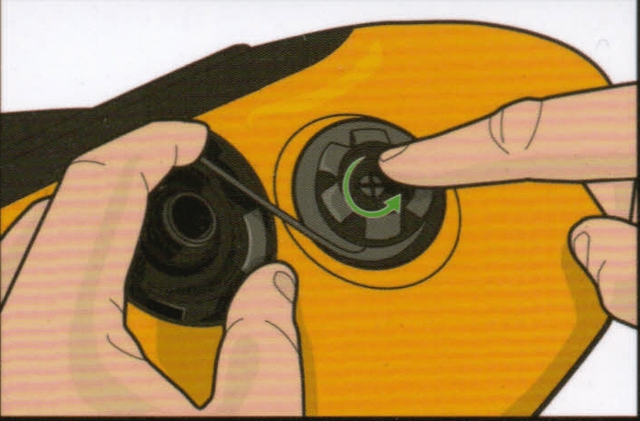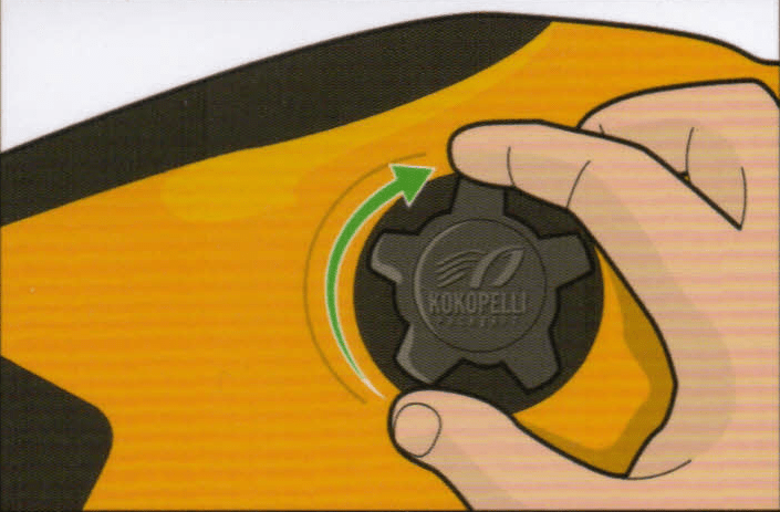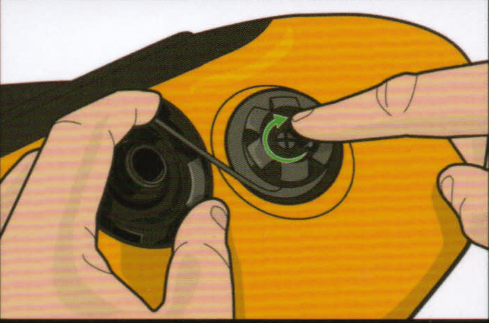 Verwijder de klep boven het ventiel. Duw het staafje met de veer in en draai een kwartslag naar links. Het ventiel staat nu open. Je kan de binnenkant van de boot zien. Oefen het open en dicht draaien een aantal keer. Dat komt straks nog van pas …