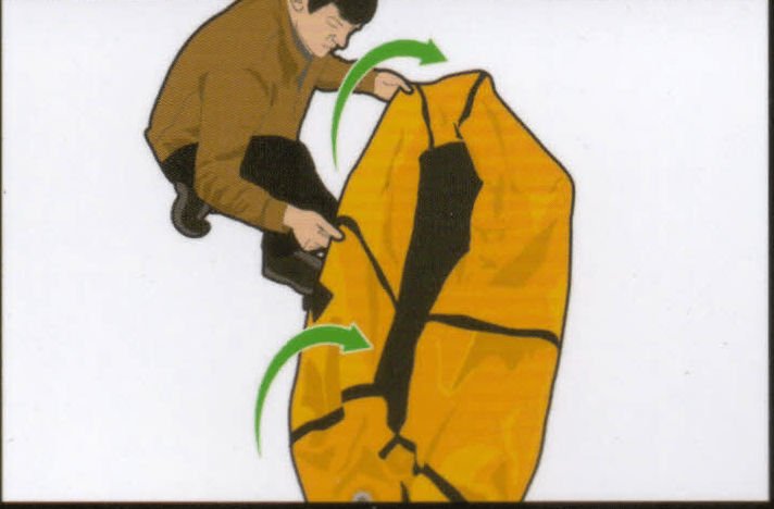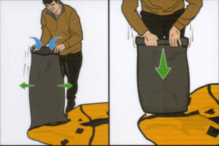 Schud de blaaszak open zodat deze zich vult met lucht. Hou de zak eventueel tegen de wind in zodat de lucht erin geblazen wordt. Vang de lucht in de zak door de bovenkant dicht de vouwen en met een hand toe te knijpen. Duw met de andere arm de lucht in de packraft of rol het gesloten einde naar beneden.